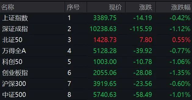 今日早盘,A股整体震荡调整,北证50走势相对独立,一度放量涨逾1%,再创阶段性新高,并逼近历史最高点,上证指数、深证成指等则低开低走小幅下挫。下跌个股远多于上涨个股,成交保持平稳。