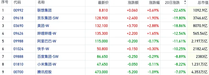 同期,港股大型科技股的表现也是差强人意,联想集团、京东、美团、阿里巴巴跌幅均达两位数。
