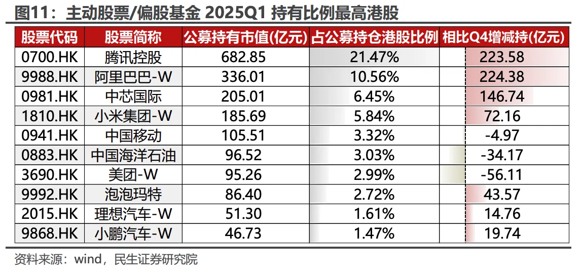 另据民生证券的研究,一季度公募基金持股比例最高的港股仍是科技股为主。其中腾讯控股、阿里巴巴、中芯国际、小米集团位居前四,合计持仓金额超1400亿元。