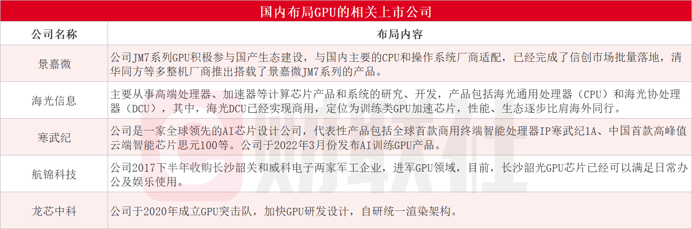 国内相关的上市公司主要有景嘉微、海光信息、寒武纪、龙芯中科、航锦科技等。