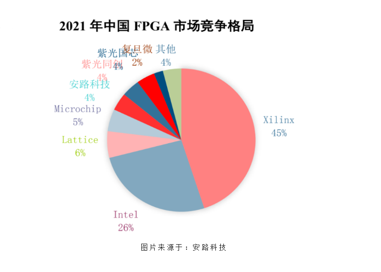 国内FPGA厂商以紫光国微、复旦微电、安路科技等为代表,在2021年中国的总份额超过15%。随着国产化的推进,中国市场具有广阔的提升空间。
