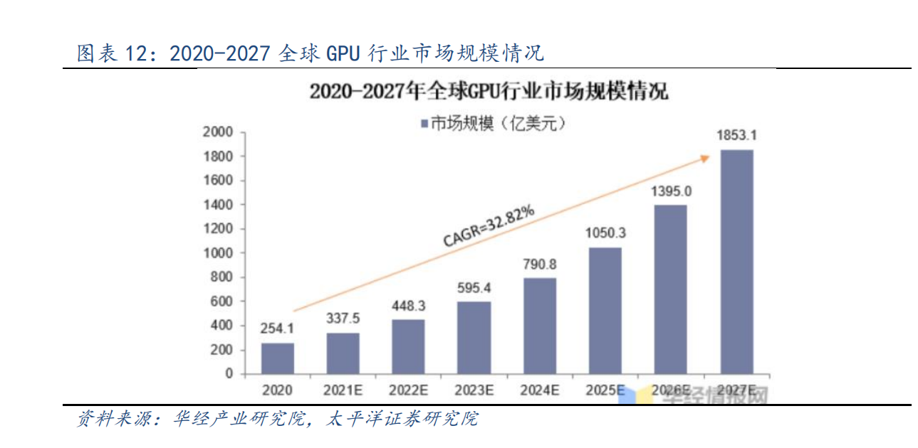 根据华经产业研究院发布的《2021-2026年中国GPU行业发展监测及投资战略规划研究报告》,2020年全球GPU行业市场规模达254.1亿美元,预计2027年将达到1853.1亿美元,复合年均增长率32.82%,GPU市场保持高速增长态势。
