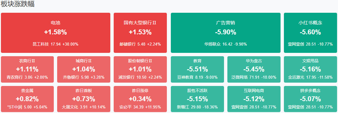 板块方面,Sora概念、AI教育、AI医疗、影视传媒、DeepSeek概念股跌幅居前;电池、银行、黄金股表现相对领先。