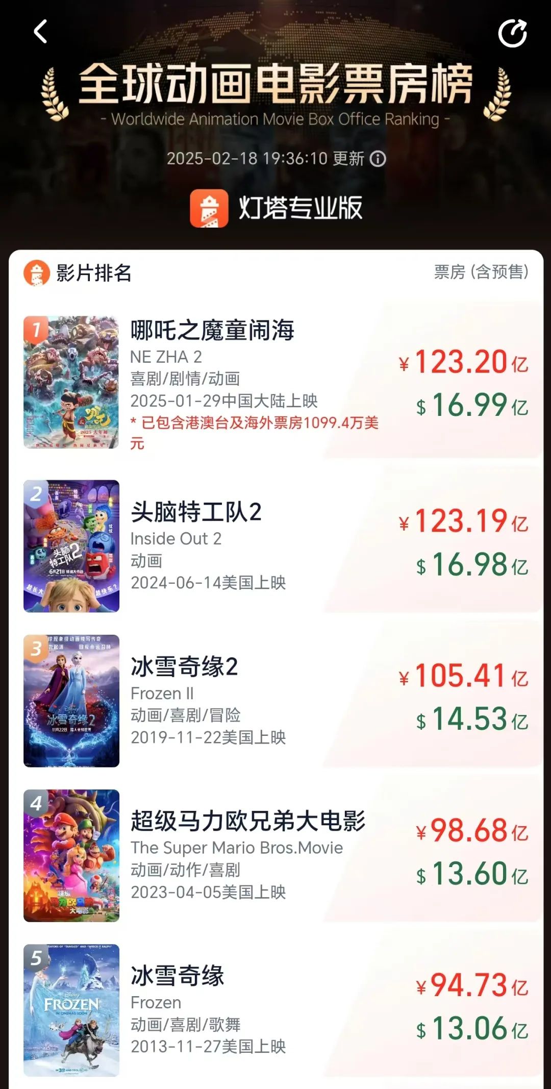 灯塔平台数据显示,截至2月18日19时36分,电影《哪吒之魔童闹海》(下称《哪吒2》)票房已经超过123.19亿元,超越《头脑特工队2》,成为全球票房最高的动画电影。