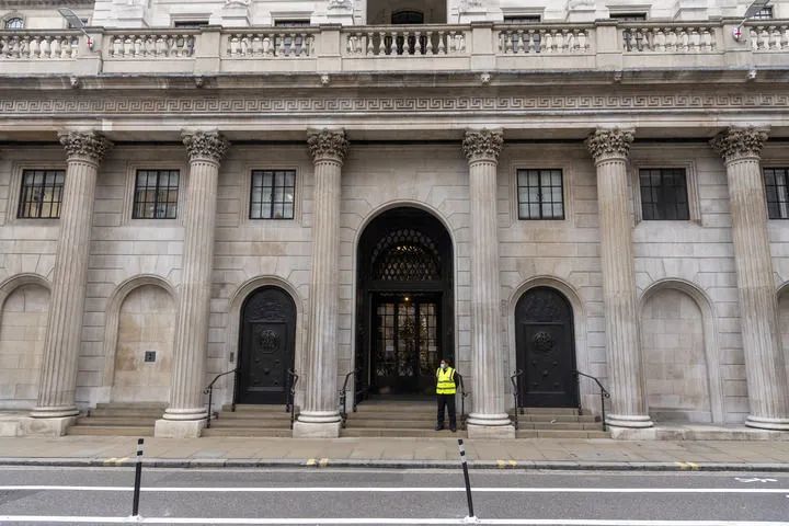 2021年12月16日,一名安保人员站在英国伦敦的英格兰银行外。新华社发(雷伊·唐摄)