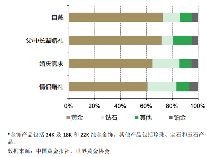 根据世界黄金协会发布的黄金消费洞察,“自戴”已成为消费者最重要的珠宝消费场景,以“自戴”为目标的消费者贡献了近 40%的零售收入。而以往被认为首饰(以金饰为主)销售大头的婚庆需求则贡献了 20%的销售额。其中女性是推动金饰销售的中坚力量。