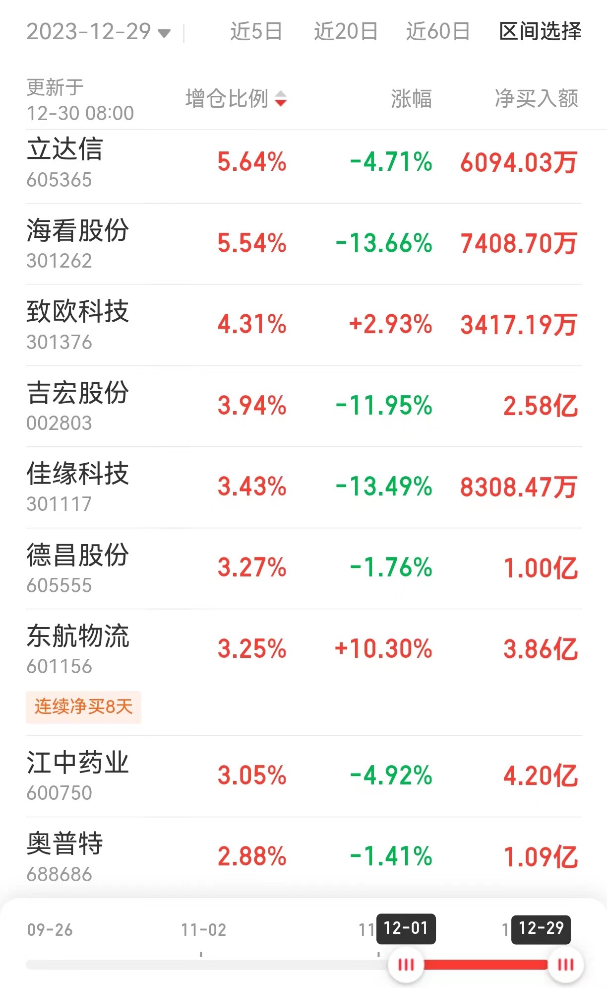 从增仓幅度看,据同花顺沪深港通数据,在12月1日至12月29日期间,获北向资金增持比例超过2.8%的A股上市公司包括立达信、海看股份、致欧科技、吉宏股份、佳缘科技、德昌股份、东航物流、江中药业、奥普特、中源协和,具体情况见下表: