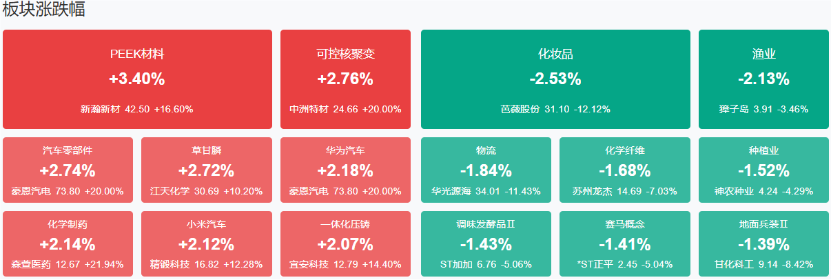 板块方面,PEEK材料、可控核聚变、智能座舱、人形机器人等板块涨幅居前,物流、美容护理、保险、白酒等板块跌幅居前。截至收盘,沪指跌0.4%,深成指跌0.07%,创业板指跌0.19%。