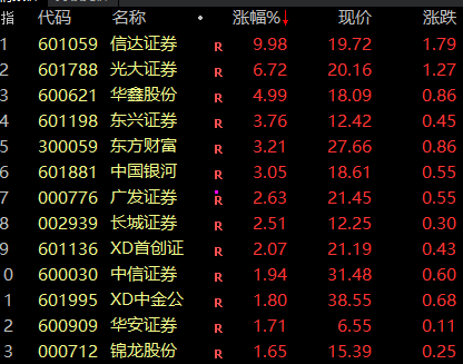 值得注意的是,券商股再度走高,信达证券涨停,光大证券涨逾7%,东兴证券、中国银河、东方财富等跟涨。