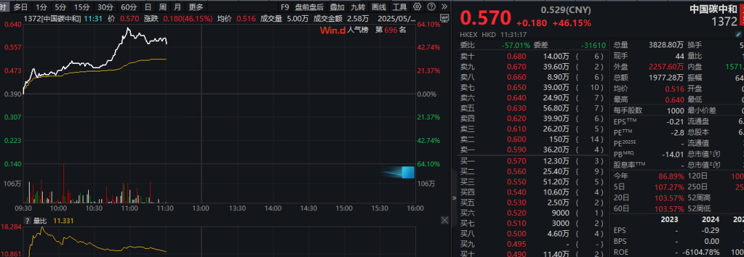 其他大幅波动的港股中,中国碳中和盘中飙涨,盘中涨幅超过60%。