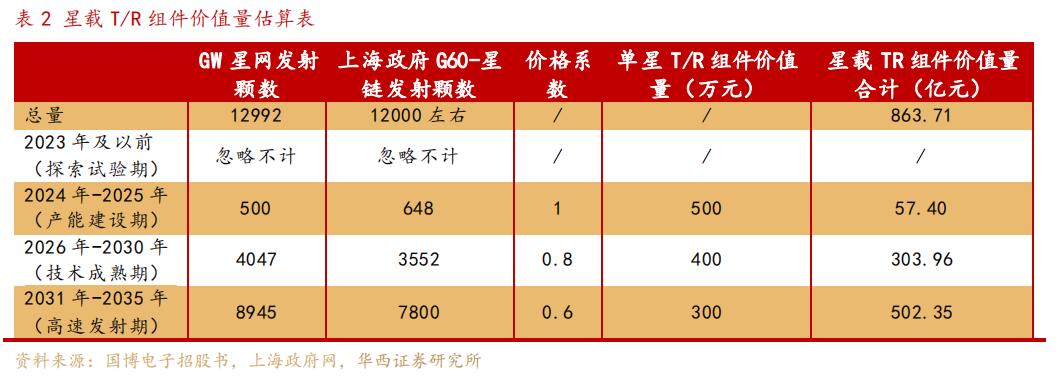 市场空间方面,根据国博电子招股书,T/R组件单价在1.35-1.65万元,那么单星T/R组件价值量约400~500万元。据机构估算,星载TR组件未来整体市场空间约为863.71亿元,考虑到替换问题和除GW星网和G60-星链外的我国其他卫星发射计划,星载TR组件高达近千亿价值量,而未来用户终端所需相控阵天线市场将更广阔。