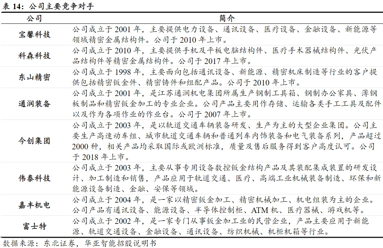 华亚智能:公司是华东地区的精密钣金制造商之一,主要涉及轨道交通、半导体设备、精密仪器、医疗器械、智能电网、新能源等行业的生产制造和组装,产品除满足国内企业需求之外,还远销欧洲、美洲、新加坡等国家和地区,与国内外近60家大型企业建立了长期友好的合作关系。以质优、价优、服务优三大优势立于前列地位。