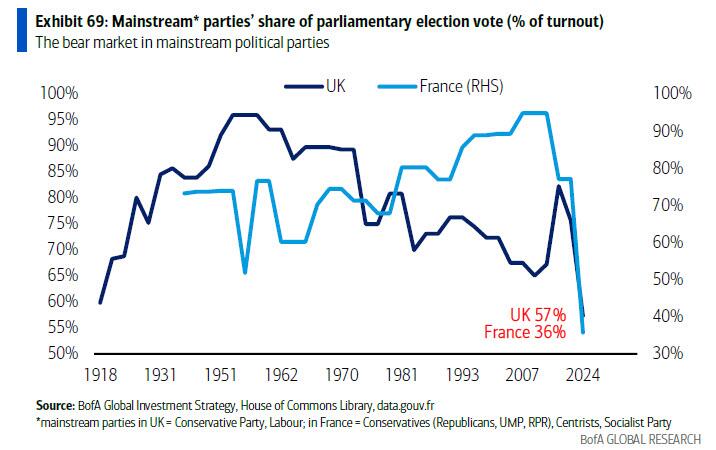2024年,举行大选的国家占世界人口的40%,占世界GDP的60%,占世界股票市值的 80%。特朗普在美国总统大选中横扫全场,这是民粹主义取得的最重大胜利,但值得注意的是,选民在2024年的32场选举中的26场中将“现任掌权者”赶下台,这一年主流政党赢得的选票份额在英国降至了1918年以来的最低水平(57%),在法国降至了1945年以来的最低水平(36%)。