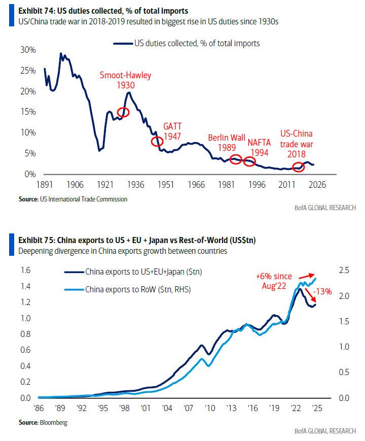美银指出,1990-2010年的和平与全球化时代在过去10年被贸易战、军事战争和更严重的地缘政治冲突所取代。美国的保护主义愈演愈烈,2018-2019年的贸易战导致美国征收的关税百分比出现自1930年斯姆特霍利关税法以来的最大增幅。中美争夺经济、技术和地缘政治主导地位的纷争扰乱了全球供应链,导致中国将出口转移到世界其他地区,远离美国、欧盟和日本,并催生了2020年代初的产业回流主题。