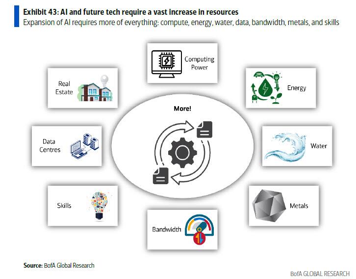美银表示,转型中的世界有着转型中的需求。技术的飞速发展将需要更多的资源和基础设施,再加上人口增长带来的日益增长的需求。尤其是人工智能AI的兴起,加速了对数据、计算能力、带宽和能源、水、商品和数据中心等扩展基础设施的需求。