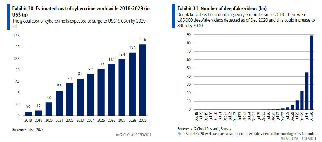 美银指出,由于人们对科技的依赖程度,网络安全将是转型世界中的头号风险。世界上大多数国家都设法度过了新冠封锁和物理社交距离,但如果无法访问数字世界,这一切可能实现吗?生成式人工智能的兴起现在创造了一个新的“威胁景观”。例如,使用逾10000块A100英伟达芯片的计算能力来训练ChatGPT,今天只需1秒钟即可破解密码。网络安全越来越成为国家安全问题,关键基础设施更容易受到攻击。