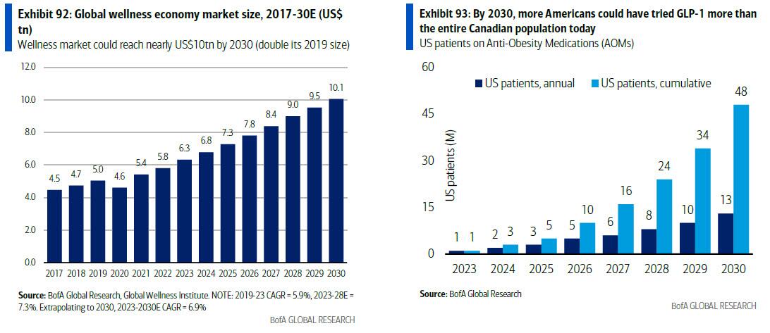GLP-1药物很可能成为关键的“生活方式”推动因素。到2030年,尝试过GLP-1药物的美国人将比目前整个加拿大人口还多。除了治疗肥胖症外,我们还看到许多其他行业受到间接影响,如消费品、食品零售商、餐馆、服装零售、博彩、酒精、烟草、老年生活。