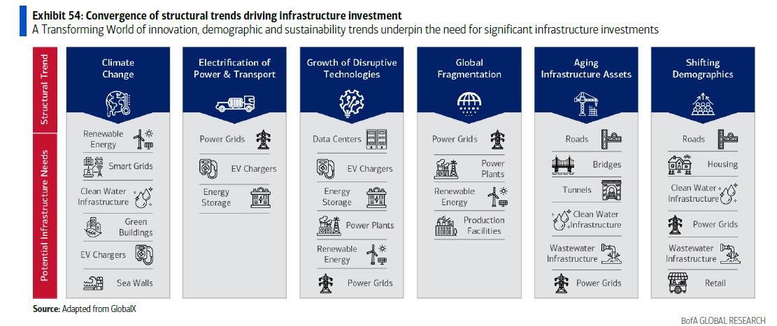 这涉及几个结构性趋势——包括脱碳、电气化、颠覆性技术、回流、人口结构变化和现有资产老化——所有这些都需要大幅增加基础设施投资。