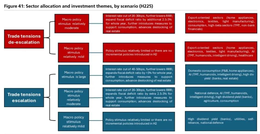 贸易摩擦缓和可能有助于出口导向型行业,并提振高贝塔行业(主要是 TMT)的股价;否则,投资者可能更倾向于防御性、自主可控和防御性 / 高股息股票。假设政策刺激较强,消费和房地产行业可能受益最大。如果政策力度温和,服务业和人工智能主题可能会有资金流入。