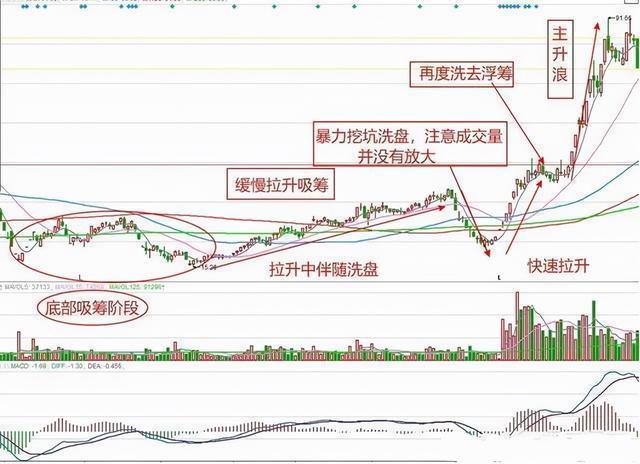 主要资金一般会在底部吸筹——拉升并继续吸筹——洗盘——主浪上涨市场——出货。
