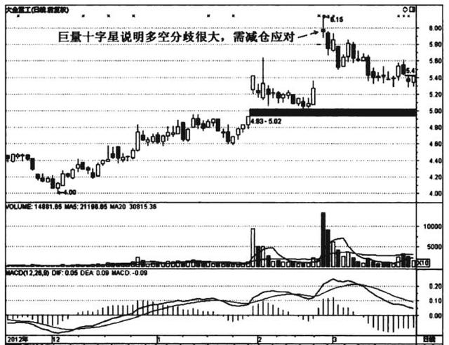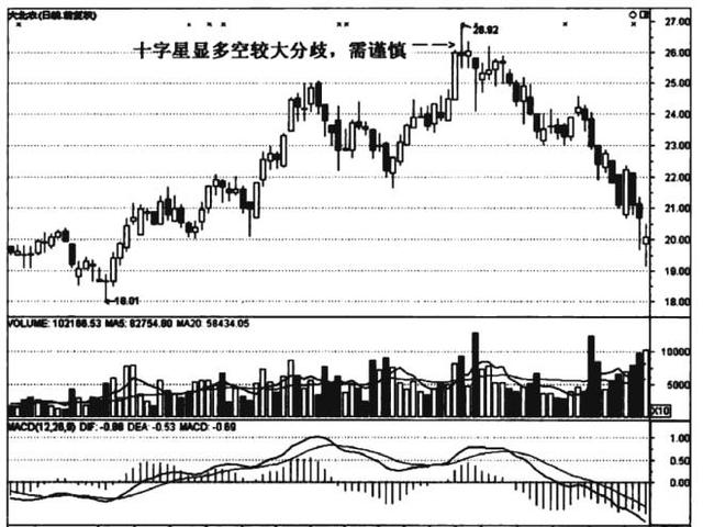 (2)此长十字星说明多空分歧较大,当日巨量则说明大资金出逃,是个危险信号。