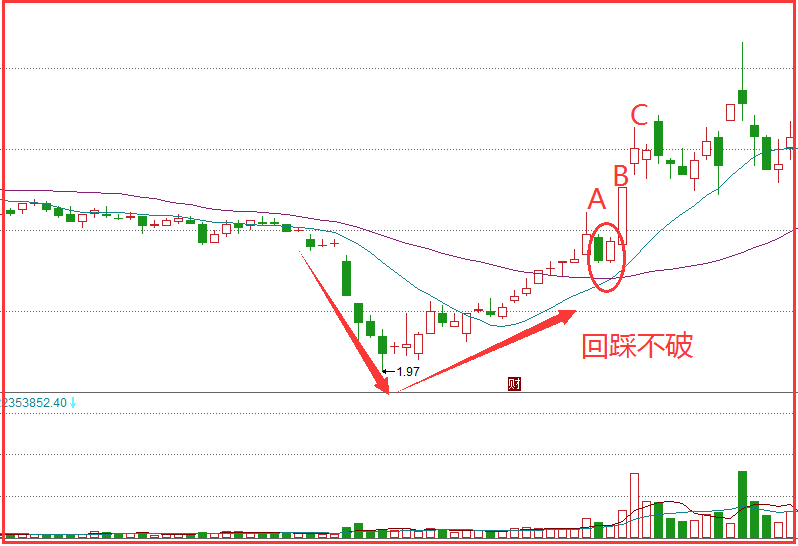 当13日均线由下往上穿过34日均线构成金叉上行行情,A点处回踩后不破两条均线交点,第二天B点的开盘价直接在前一天阳线的收盘价附近走出高开高走行情,这就是我们应该积极进场的时候。