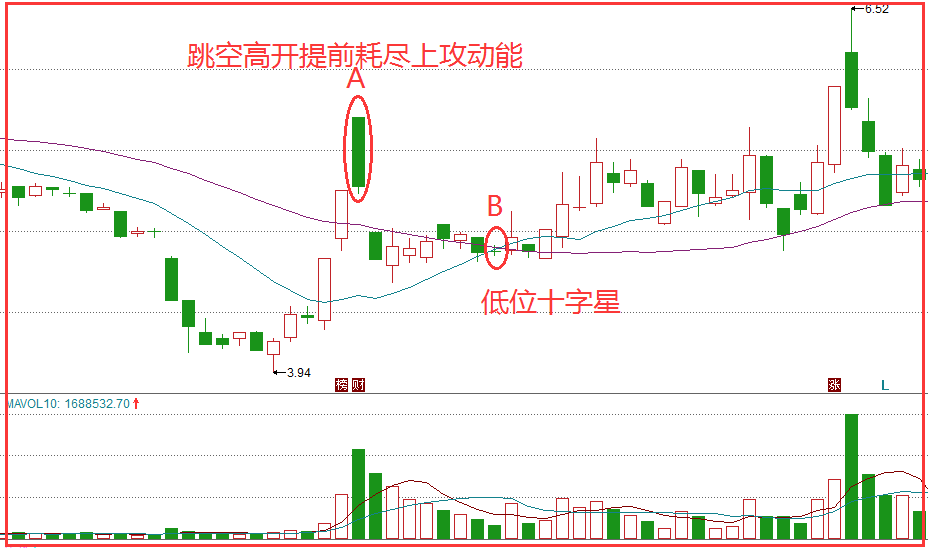 随后指数开始在低位走出横盘整理的走势,当某一天B点出现在两条均线的交叉处,我们看到B点是形成一个低位十字星行情,这是一种即将上涨的变盘信号。