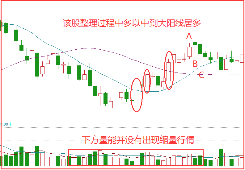 我们看到该股除了有在案例二中重点强调的量能没有萎缩的问题,另一个大问题就是上方的K线走势,我们一直强调主力想要拉升,一般都是会以比较隐蔽的手法去操作,该股这种时不时出现中到大阳线的行情,很容易吸引到想坐主力轿子的投资者,这也不利于主力后期的拉升。