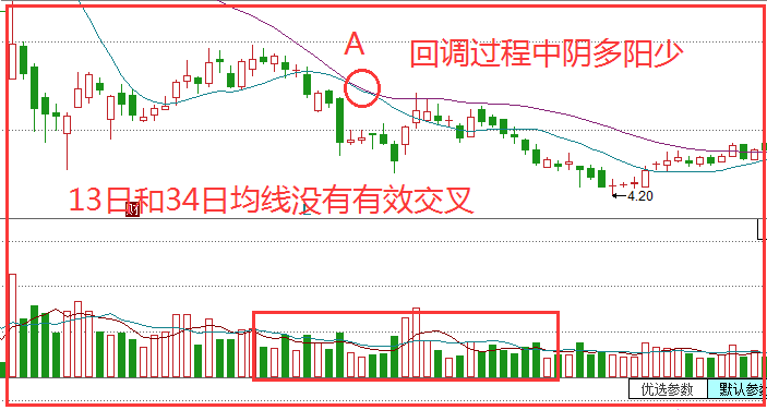 在这只个股中我们看到同样是13日均线和34日均线构成金叉,为什么这只个股走势就没有出现案例一中的行情呢?