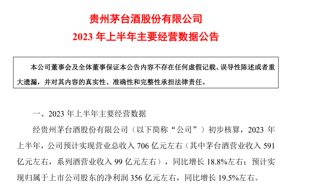 7月13日晚,贵州茅台(600519)披露上半年主要经营数据,预计实现营业总收入706亿元左右(其中茅台酒营业收入约591亿元,系列酒营业收入约99亿元),同比增长约18.8%;预计实现净利润356亿元左右,同比增长约19.5%。