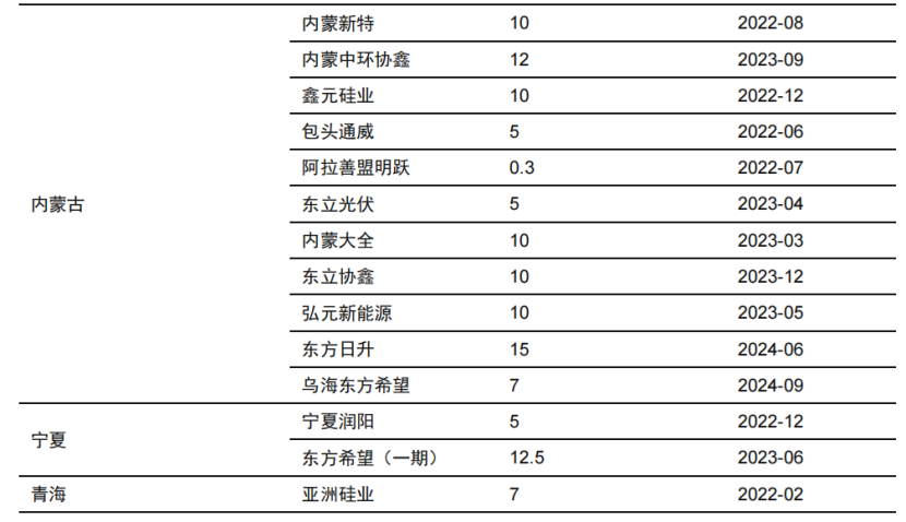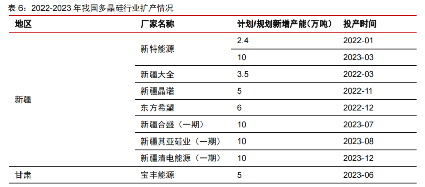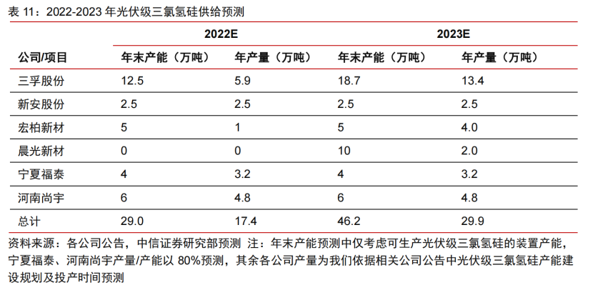 光伏级三氯氢硅供给主要集中于三孚股份、晨光新材、宏柏新材等上市公司。其中2022年新增产能为三孚股份5万吨/年、宏柏新材5万吨/年,均于2022Q3产能释放,预计2023年新增产能为三孚股份7.22万吨/年、晨光新材20万吨/年,其中三孚股份产能于2023Q1释放,晨光新材产能于2023Q3释放。