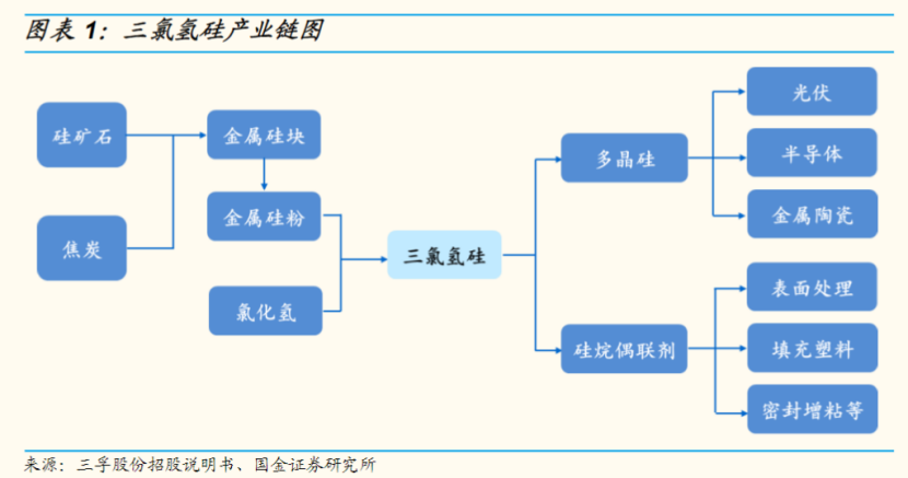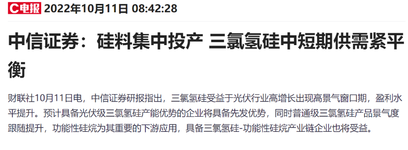 券商研报近期指出,硅料集中投产,三氯氢硅中短期供需紧平衡。三氯氢硅受益于光伏行业高增长出现高景气窗口期,盈利水平提升。预计具备光伏级三氯氢硅产能优势的企业将具备先发优势,同时普通级三氯氢硅产品景气度跟随提升,功能性硅烷为其重要的下游应用,具备三氯氢硅-功能性硅烷产业链企业也将受益。