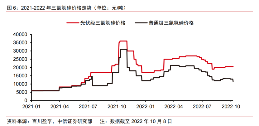 值得注意得是,光伏级三氯氢硅价格快速提升,2021年最高价格达3.6万元/吨,相较于2021年初的6000元/吨增长约5倍,2022年9月均价为2万元/吨,月均价环比+2%。