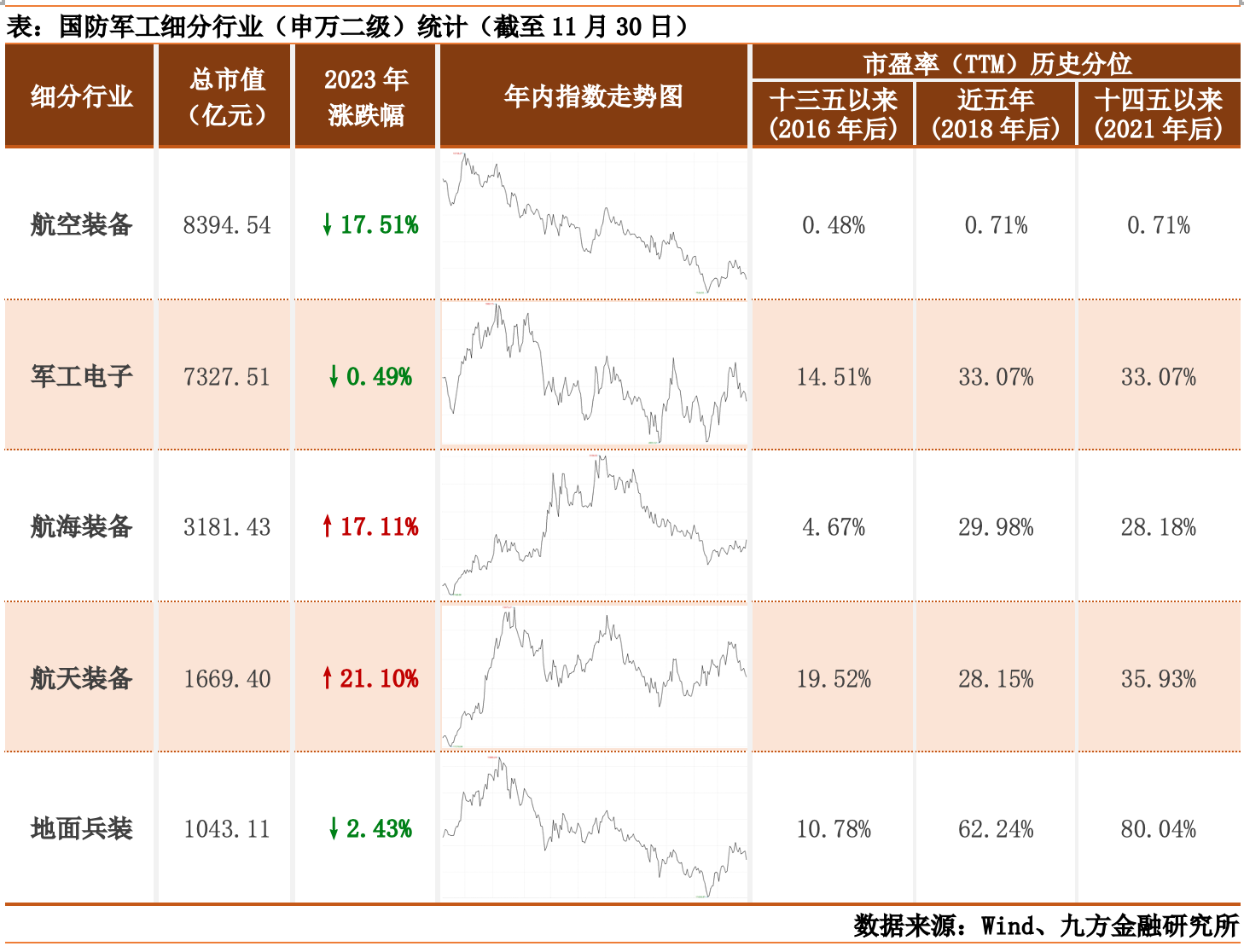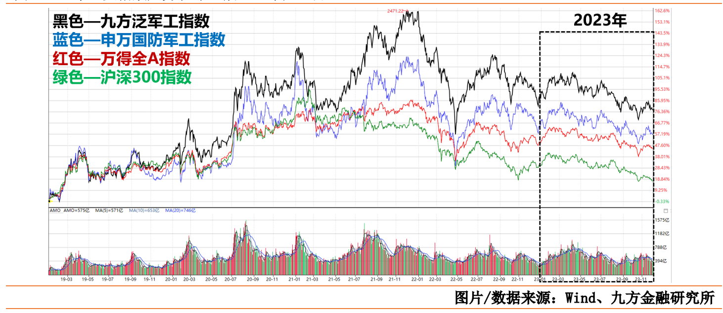 回望2023年,A股国防军工板块在市场内外的多重因素作用下延续了去年以来的弱势特征。截至11月30日,九方泛军工指数的年内涨跌幅为-5.5%,表现虽不及万得全A指数(同期跌幅为3.2%)但显著优于沪深300指数(同期跌幅达9.7%)。
