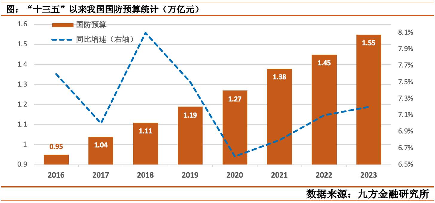 综合当前市场观点,机构一致认为,我国大概率将在2024年继续维持近年来在国防军事领域的相对投入力度,即在维持国防支出占GDP比例稳定的同时依旧保持军费支出的增速与总固体经济增速之间的合理的相对关系。同时,国内似乎正在准备酝酿新一轮现代化装备生产交付浪潮。