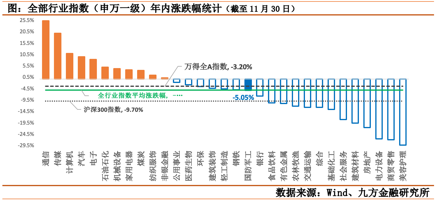 纵观今年市场全貌,31个申万一级行业中仅有约三分之一录得年内上涨。其中,国防军工指数的年度涨跌幅接近全部行业指数平均水平、略低于全行业指数涨跌幅中位数。