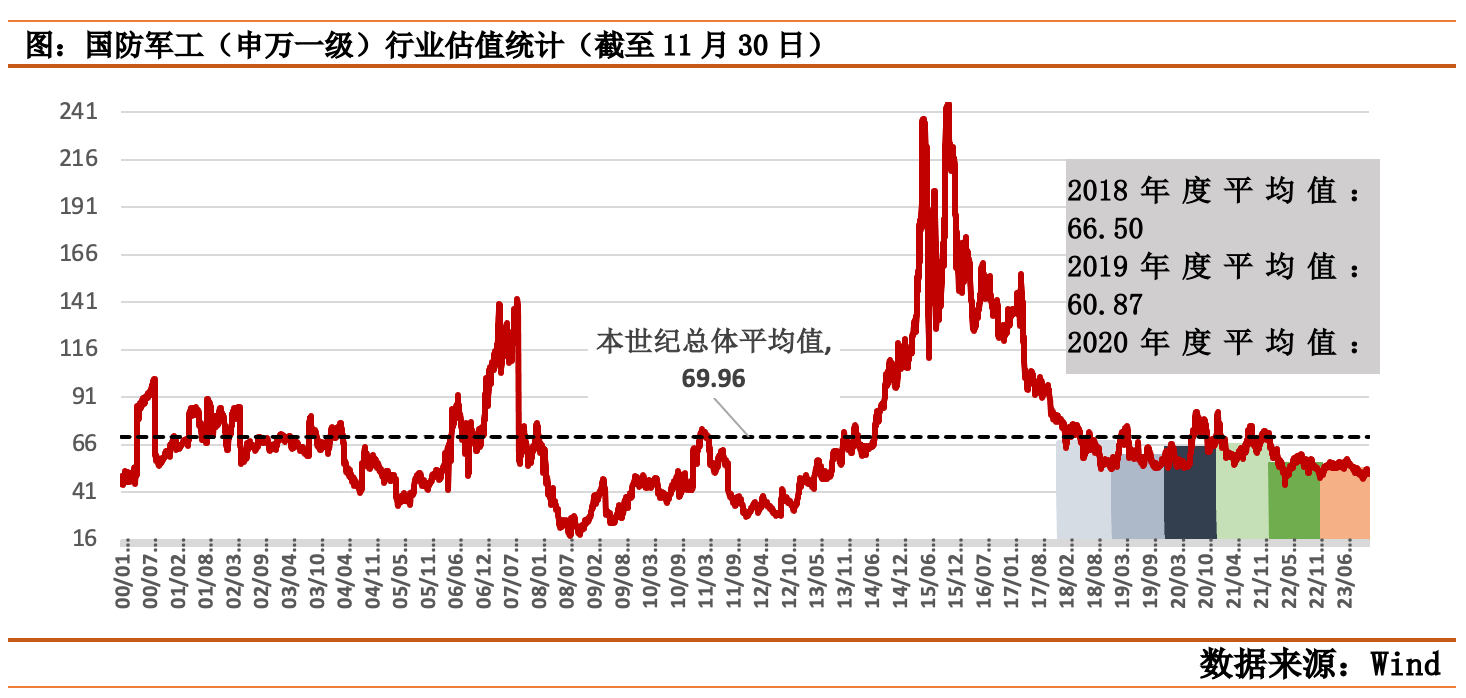 估值方面,国防军工行业板块的市盈率在“十三五”后期以来一直维持在本世纪平均水平附近,较为合理。但是,行业近两年的估值中枢明显低于2018-2021年;行业估值存在向上均值回归的空间与潜力。
