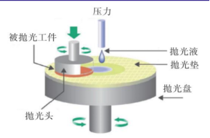 抛光的具体流程是,将晶圆固定于抛光头上,对抛光头施加一定压力使其与抛光垫充分接触;抛光头与抛光垫在电机驱动下以一定速度和方向旋转,同时将抛光液通过加液系统滴加到抛光垫上,使晶圆表面与抛光液中的化学试剂发生化学反应,形成一层较软的氧化膜层;再利用抛光液中的磨料与抛光垫的机械摩擦作用去除软质层,通过化学腐蚀与物理研磨的交替进行获得高度平坦化、无划痕和杂质玷污的晶圆表面,实现全局平整落差100A-1000A°(相当于原子级10~100nm)超高平整度,使下一步的光刻工艺得以进行。