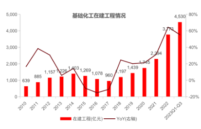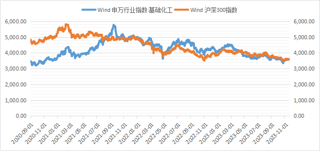 2023前三季度,化工行业资本开支2496亿元,同比增长10.42%;行业在建工程和固定资产分别为4530亿元和12631亿元,同比分别增长55.2%和24.5%;在建工程占比总固定资产比列达到35.8%。虽然本周扩产周期接近尾声,但是大量的产能扩张也带来了阶段性产能严重过剩,化工品价格大多处下降周期中,或者处在历史价格低位区间震荡。