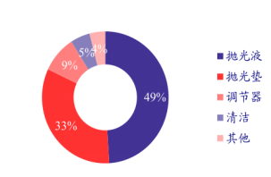 CMP系统主要由抛光设备、抛光液和抛光垫三部分组成。其中,抛光液和抛光垫是CMP工艺流程的核心耗材。从价值量占比来看,CMP材料是晶圆制造的核心耗材,占晶圆制造总成本的约7%;抛光液和抛光垫,最核心材料,分别占CMP材料总价值的49%和33%,两者决定了CMP工艺的基础抛光效果,并与设备操作、硅片等因素共同影响最终的抛光效果与效率。
