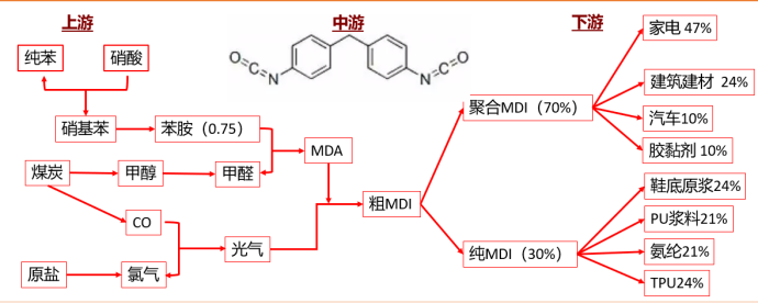 MDI产业链上游主要原料苯、煤炭、原盐,中游企业通过大化工合成制成MDI,MDI下游应用广泛,主要应用在家电,建筑建材,保温隔热,纺织服装,汽车,胶黏剂等经济需求的各个方面。