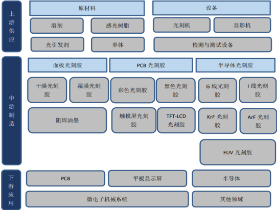 光刻技术是利用光化学反应原理和刻蚀方法将掩模版上的图案传递到晶圆的工艺技术,原理起源于印刷技术中的照相制版。光刻胶是光刻工艺中的关键材料,主要应用于显示面板、印刷电路板、集成电路三大领域,分别为面板光刻胶(LCD光刻胶)、PCB光刻胶和半导体光刻胶(芯片光刻胶)。