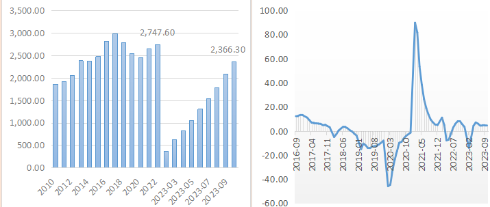 汽车产销量数据今年同比增长,1-10月份累计产量到了2366万辆。同比逼近2位数增长。