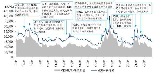 MDI价格主要受到供需错配的影响。17,18年,MDI供给端装置检修和爆炸事故导致供给短缺,而需求端旺盛,导致价格一度突破4万元/吨。影响MDI价格的核心变量包括:供给端装置的开工率,检修周期,是否有事故。而需求端MDI全球的需求是趋于稳定的,季节性每年金九银十是需求旺季,价格上涨概率大。