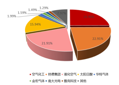 全球主要市场份额被空气化工、林德集团、液化空气、以及太阳日酸四家公司所占据,占比超过90%。而中国电子特气市场层面,根据SEMI的数据显示,2022年中国电子特气市场规模估算为220.8亿元;2023年预计为249亿元。根据2021年数据,国内主要市场份额亦被上述四家公司所占比,国内企业所占份额约20%。国内的电子特气龙头有:华特气体,金宏气体,雅克科技,南大光电等。