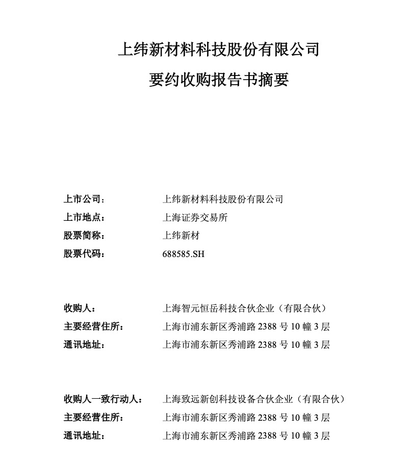 7月8日晚间,根据《上纬新材料科技股份有限公司要约收购报告书摘要》,智元机器人拟通过公司及核心团队共同出资设立的持股平台,以协议转让和要约收购的方式取得公司控制权。根据摘要,若本次交易完成之后,智元方通过股份转让和要约收购的方式至少持有上市公司上纬新材(688585.SH)63.62%的股份,最高可合计持有66.99%股份。