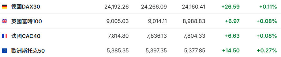 2.截至发稿,德国DAX指数涨0.11%,英国富时100指数涨0.08%,法国CAC40指数涨0.08%,欧洲斯托克50指数涨0.27%。