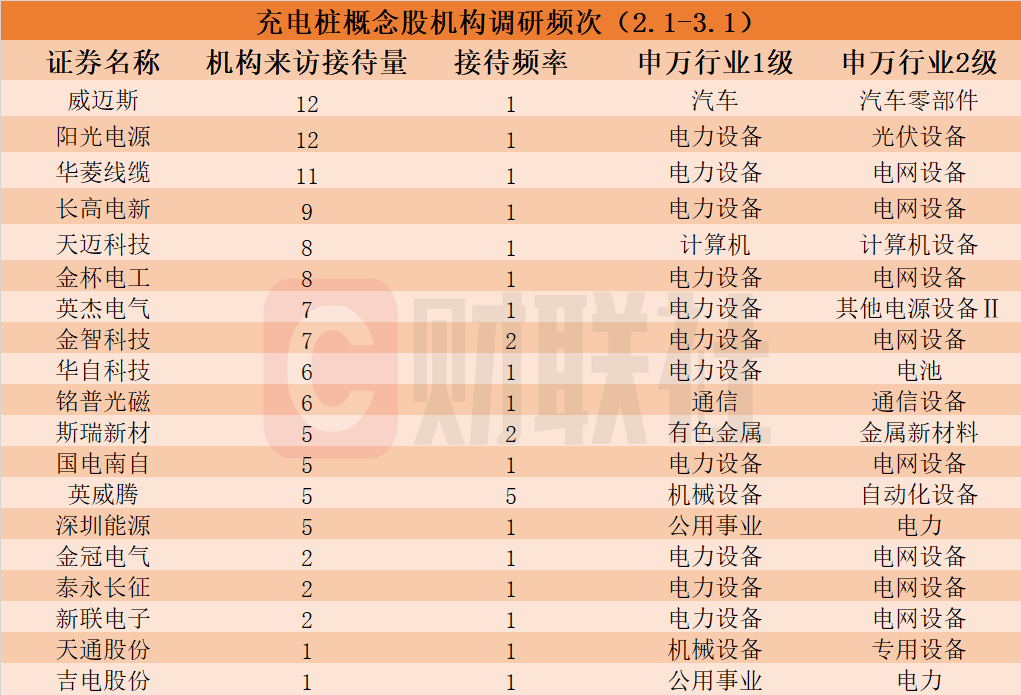 此外,近一个月机构来访接待量排名靠前的上市公司还包括威迈斯、阳光电源和华菱线缆,分别达12家、12家和11家。不过值得注意的是,上述3家上市公司均未在机构调研中明确回复充电桩相关业务布局事宜。