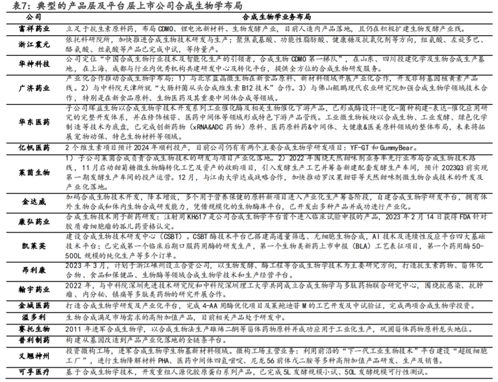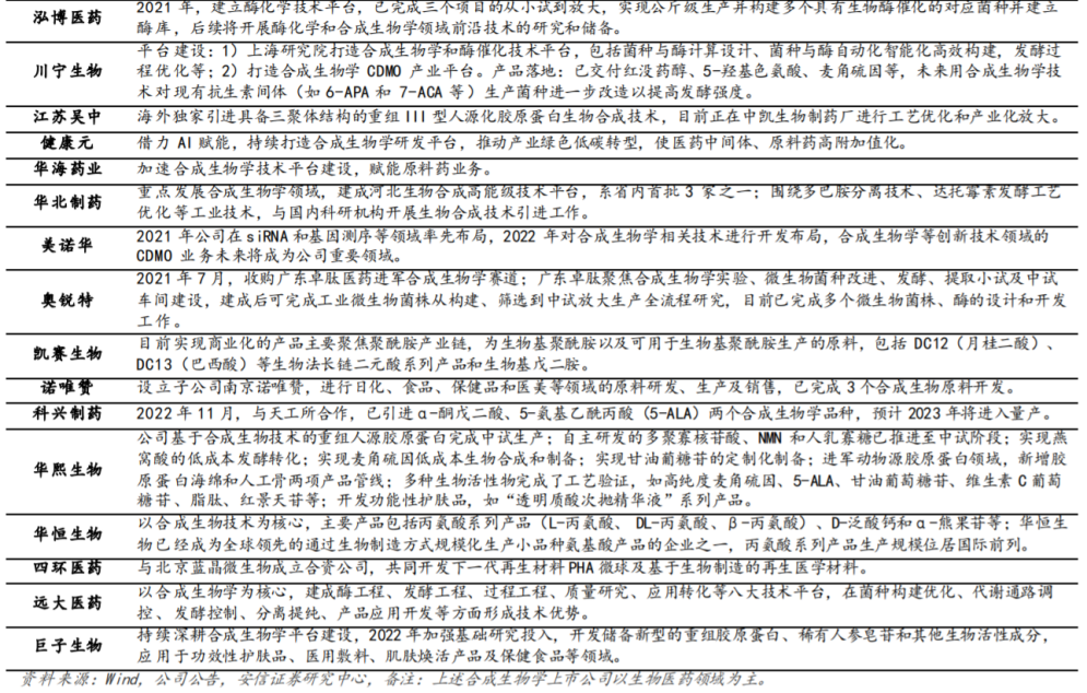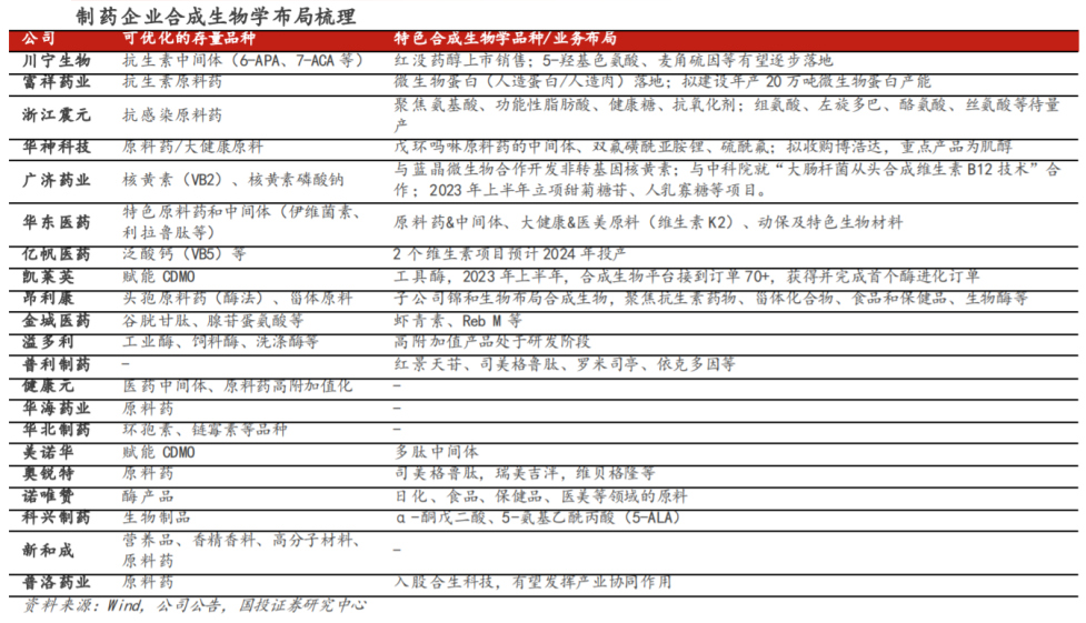 生物制造:特色合成生物学产品陆续落地及放量的企业:川宁生物、富祥药业、金城医药、普利制药、浙江震元、华神科技等。
