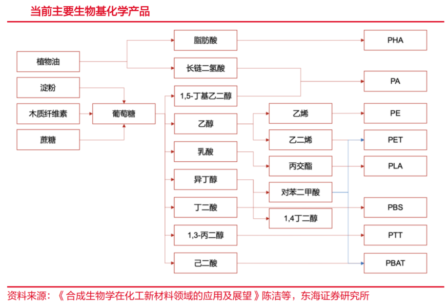生物基材料是以淀粉、木质纤维素、蔗糖和植物油等为原料,通过生物合成等方式形成脂肪酸等有机酸、生物醇、烯烃和烷烃等生物基化学物质,再经过进一步得到生物基塑料和生物基纤维等终端产品。